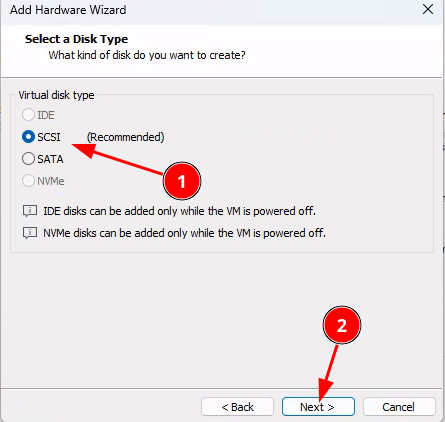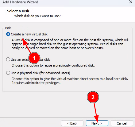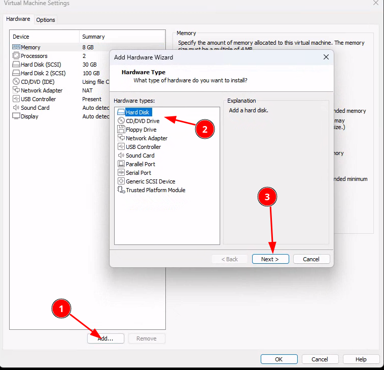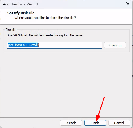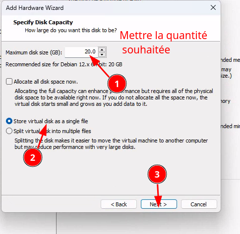 Ajout du disque sur le logiciel de virtualisation