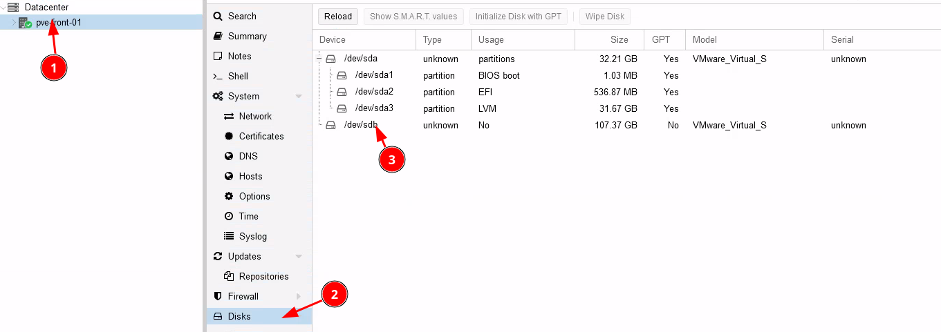 Paramétrez le nouveau disque dans la console web de Proxmox